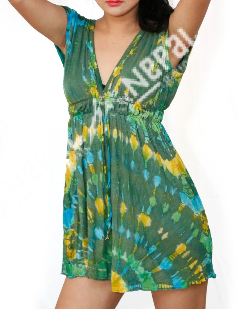 This eye-catching tie-dye cotton dress features a vibrant blend of yellow and blue hues on a rich green base, creating a unique and lively look. Designed to stand out, the colorful pattern adds a fresh and artistic touch to your wardrobe.