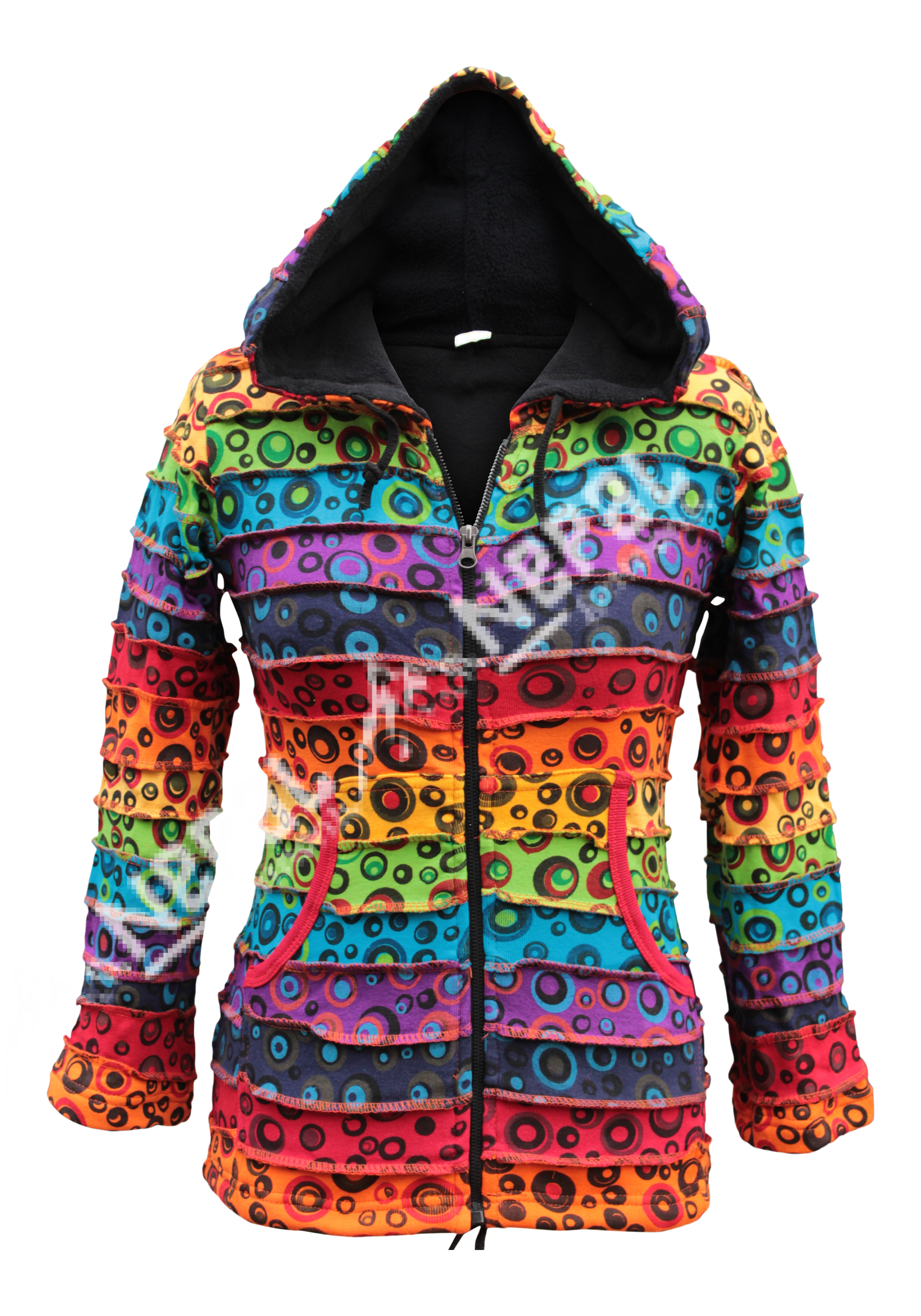 This vibrant multi-colored hoodie features a cozy hood, two side pockets, and a durable YKK front zipper. Enhanced with razor-cut details, colorful patterns, and unique bobble-print patchwork designs, its eye-catching colors and handcrafted look make it perfect for music festivals, casual outings, or any occasion where you want to stand out.